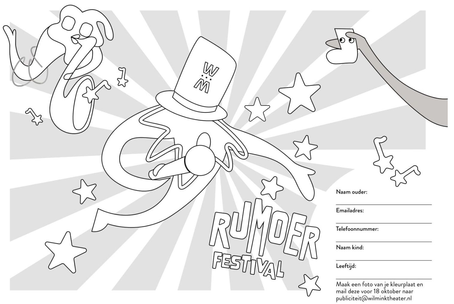 De kleurplaten zijn gratis af te halen bij het Wilminktheater of te downloaden hieronder. Lever hem in vóór 18 oktober bij onze kassa of via publiciteit@wilminktheater.nl.