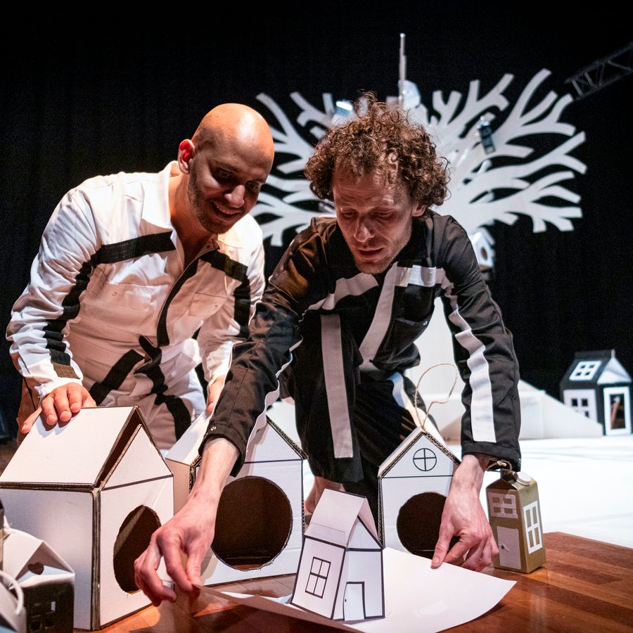 Poëtische en grappige voorstelling waarin Achref en Kristján, met mime en muziek, zoeken naar wat thuis zijn betekent.
