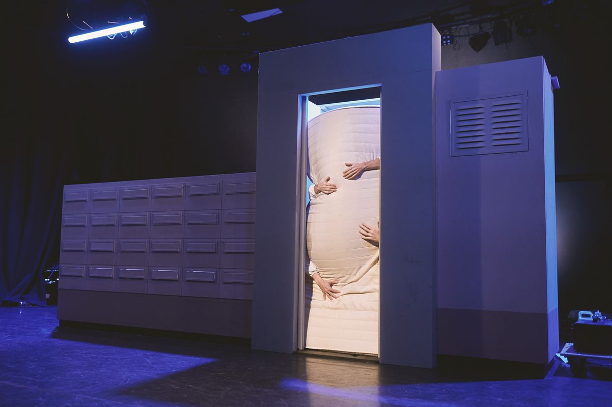 Joosen: “Ons decor bestaat uit een lift en een blok met brievenbussen. Die brievenbussen zijn als metafoor voor al die verschillende opgestapelde huizen.”