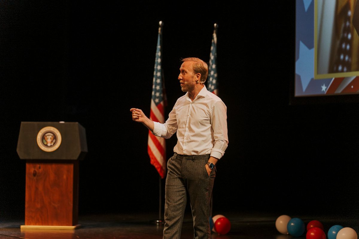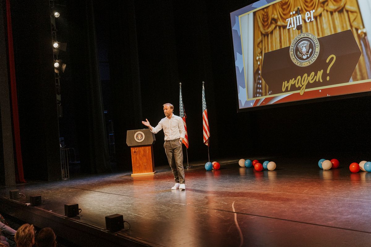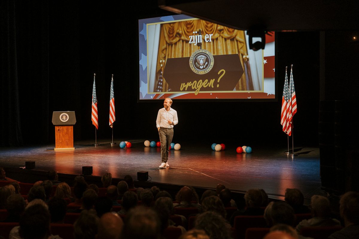 Het theatercollege van Raymond Mens is een leuke, interactieve, audiovisuele voorstelling met veel (tv)beelden van speeches, debatten, bijeenkomsten en bizarre gebeurtenissen uit de Amerikaanse politiek. Zijn vorige theatercollege ‘Lange Leve Amerika’ trok ruim 17.000 bezoekers en werd lovend ontvangen.