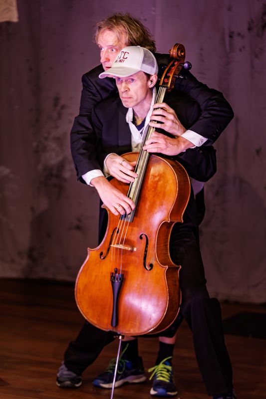 Topcellisten Pepijn Meeuws en Emile Visser transformeren een klassiek concert tot absurdistisch theater.