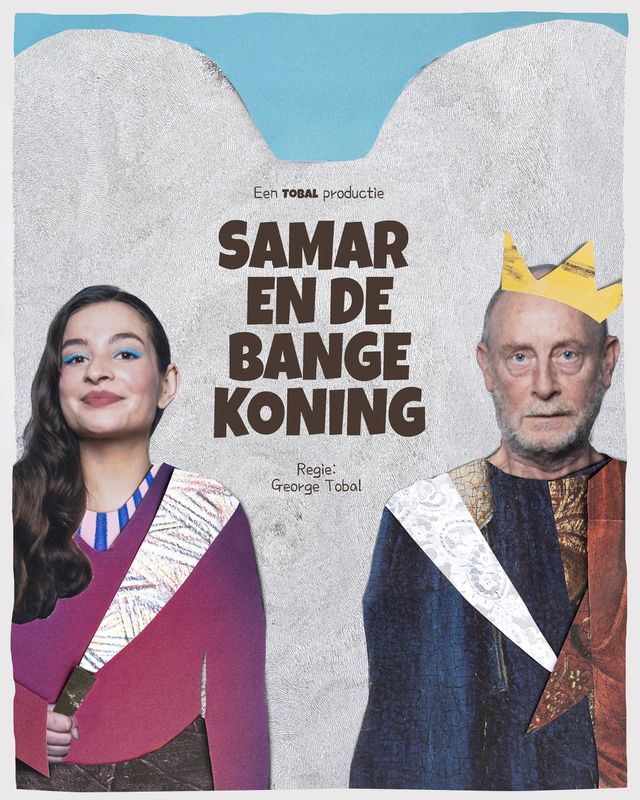 Beeld van de voorstelling met Samar en de bange koning in koninklijke kleding naast elkaar, waarbij de man een papieren kroon draagt en de titel “Samar en de bange koning” centraal staat.