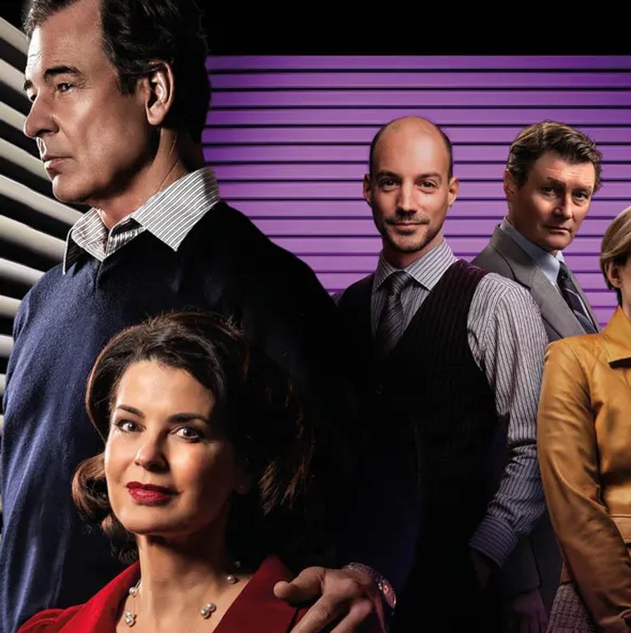 REP Entertainment brengt de Hitchcock-klassieker Dial M for Murder op het podium als een geslaagde thriller vol spanning. Het decor is strak en donker, met een grote klok en Hitchcock-portret die de spanning versterken.
