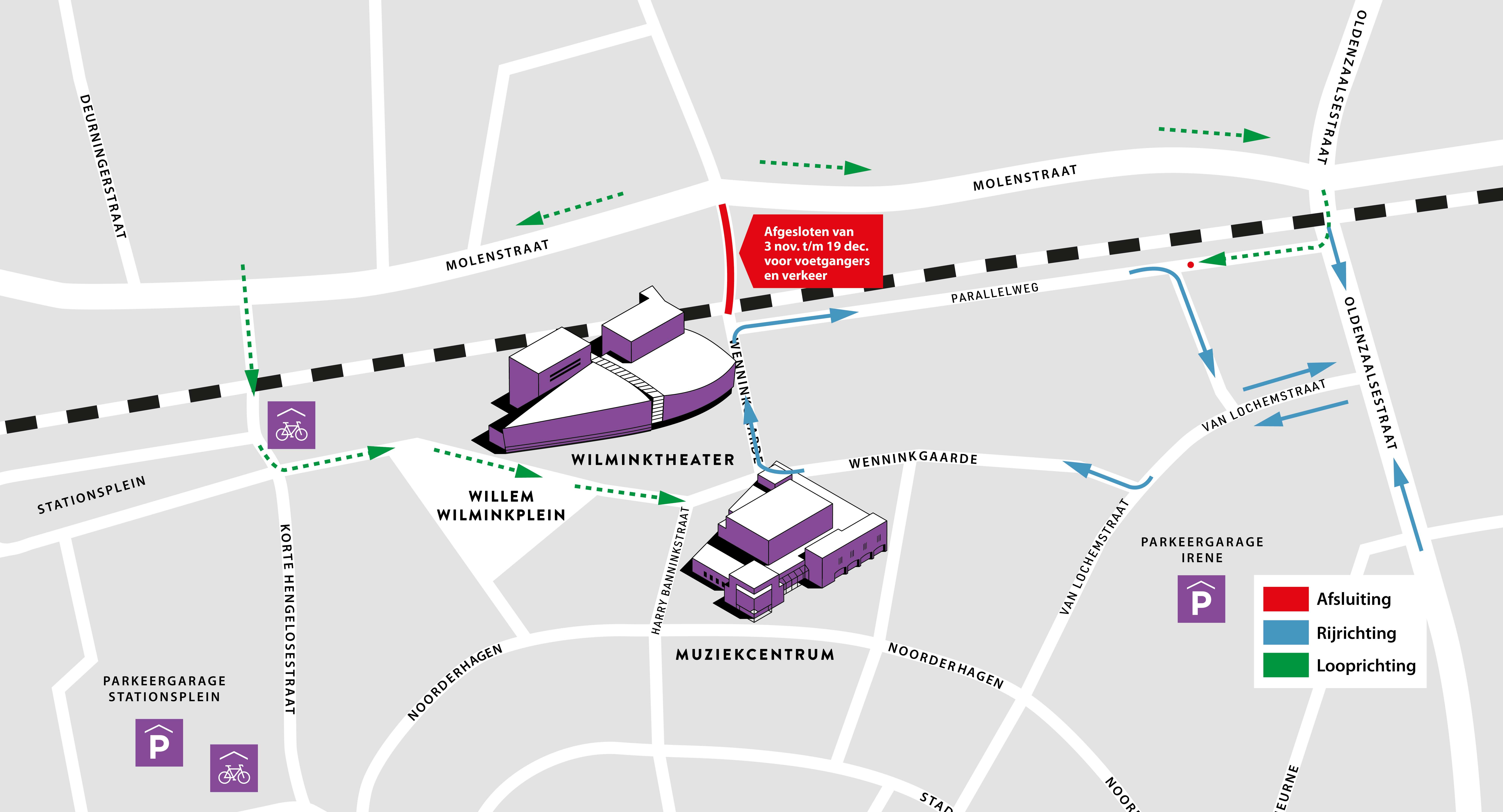 De gratis fietsenstalling onder het Willem Wilminkplein biedt ruimte aan 520 fietsen. Uw fiets hier stallen kan 24 uur per dag, met camerabewaking, gratis en droog in hartje Enschede. De locatie is ideaal voor uw bezoek aan ons theater en biedt daarnaast zelfs oplaadpunten voor uw elektrische fiets. Deze stalling is vanwege de helling niet geschikt voor bakfietsen.